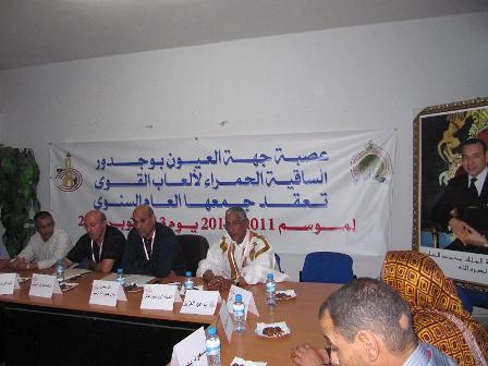 جددت أندية عصبة جهة العيون بوجدور الساقية الحمراء لألعاب القوى الثقة في حمدي ولد الرشيد رئيسا للعصبة، و ذلك خلال الجمع العام السنوي لموسم 2011/2012 الذي عقد مساء يوم الإثنين 03 أكتوبر الجاري، بمقر العصبة بملعب الشيخ محمد الأغضف بالعيون، بحضور ممثل الجامعة الملكية المغربية لألعاب القوى ” لحسن الراية ” وممثل الشبيبة والرياضة وممثل السلطة المحلية غضافة إلى ممثلو الأندية المنخرطة في العصبة والذين صادقوا بالإجماع على التقريرين الأدبي والمالي. ليتم انتخاب المكتب الجديد بعد تجديد الثقة في رئيس العصبة نفسه.