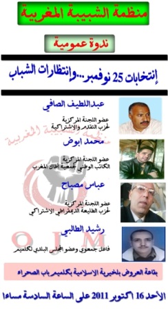 تنظم منظمة الشبيبة المغربية فرع كلميم ندوة عمومية حول موضوع “إنتــخــابــات 25 نوفــمبـر…و إنـتظـارات الــشباب” بقاعة العروض بالجمعية الخيرية باب الصحراء يوم الأحد المقبل 16 أكتوبر الجاري ابتداء من الساعة السادسة مساءا، بمشاركة وتأطير من الكاتب العام لجمعية أطاك المغرب ومشاركة لحزب التقدم والاشتراكية وحزب الطليعة. ومشاركة عضو بالمجلس البلدي ومحامي بالمدينة.