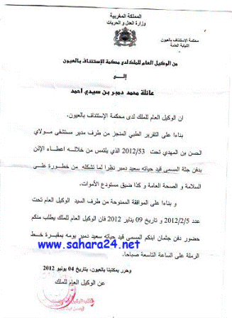 و لما اطلعت العائلة حسب البيان على الوثيقة و جدت أنها موجهة من مكتب الوكيل العام للملك بمحكمة الاستئناف بالعيون إلى عائلة محمد دمبر بن سيدي أحمد ” يطالبهم فيها بالحضور إلى دفن جثمان ابنهم” سعيد دمبر ” في حدود الساعة التاسعة صباحا بتاريخ 09 يناير 2012 بمقبرة خط الرملة بالمدينة المذكورة بناء على تقرير طبي أنجزه مدير مستشفى الحسن بن المهدي تحت رقم 53 / 2012 بدون تحديد تاريخ صدوره و بناء على موافقة الوكيل العام للملك بذات المحكمة عدد 5 / 2 / 2012 بتاريخ 09 يناير 2012 .