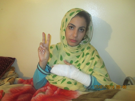 أصدر فرع الجمعية المغربية لحقوق الإنسان بيانا توصلت ” صحراء 24 ” بنسخة منه، يدين فيه الاعتداء الذي تعرضت له ” سمية المجاهد ” ( الصورة )عضو مكتب فرع الجمعية بالعيون ، مساء يوم : الأربعاء 15 يناير 2014 على الساعة السابعة مساءا بشارع القدس بمدينة العيون لاعتداء وصفه ” البيان ” بالبشع والهمجي من طرف دورية أمنية بزي مدني استهدفتها يضيف البيان على خلفية نشاطها الحقوقي داخل فرع الجمعية بالعيون المتمثل أساسا في رصد وتتبع الانتهاكات التي تطال جل الوقفات والأشكال الاحتجاجية السلمية التي تشهدها مدينة العيون .وهكذا انهال عناصر الأمن عليها بالعصي والهراوات وبوابل من السب والشتم ، مما نتج عنه إصابتها بكسر على مستوى صدغ اليد وهي الآن ترقد بمستشفى الحسن بلمهدي بالعيون في انتظار إجراء عملية جراحية دقيقة .