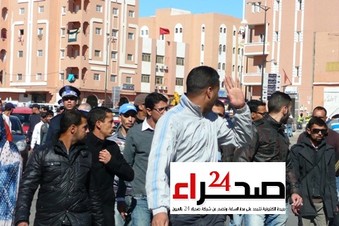 لم يترك المعطلون المحسوبين على تجمع المعطلين الصحراويين الذي يظم خريجو (ocp skils) و جمعية النهضة للمعطلين الصحراويين و مجموعة الأمل للمعطلين الصحراويين بالعيون، فرصة لوالي الجهة الجديد أن يتسلم رسميا قرار تعيينه واليا على جهة العيون بوجدور الساقية الحمراء، حتى خرجوا صباح اليوم الثلاثاء 21 يناير الجاري، في مسيرة احتجاجية كما عاينت ذلك ” صحراء 24 ” بشارع السمارة، و التي ووجهت بتدخل أمني ، ليتحول شارع السمارة إلى ما يشبه مطاردات في الشارع ، في حين تم تسجيل إصابة كل من ” سيداتي أبك ـ زينة بلخليل ـ خدجتو الدويه ـ سيدي محمد أخريريز “.