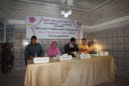 عقدت الشبيبة الاتحادية فرع العيون السفلى و فرع الدشيرة و فرع الحكونية بجهة العيون بوجدور الساقية الحمراء جمعها العام التجديدي تحت شعار ” جميعا من اجل مجتمع واع و مسؤول” و ذلك يوم السبت 08 فبراير 2014 بقاعة الشهيد عمر بنجلون بمقر حزب الاتحاد الاشتراكي للقوات الشعبية بالعيون بحضور مجموعة من شباب و شابات المنطقة و كذا أعضاء و ممثلي كل من الفرعين المحليين بالعيون و بوكراع للحزب وتمت قراءة الفاتحة على روح الفقيد محمد جسوس عالم إجتماع و أستاذ بكلية الآداب بالرباط وكانت هناك عدة مداخلات من طرف الحاضرين وفي الأخير تم إنتخاب أعضاء المكاتب المسيرة على الشكل التالي: