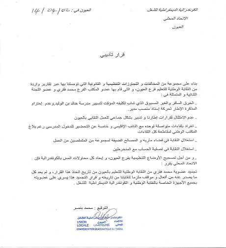 على اثر فضائحه المتتالية بقطاع التعليم، والتي حددها القرار التأديبي الذي اتخذه فرع الكونفدرالية الديمقراطية للشغل بالعيون ،في حقه مباشرة بعد صدور بلاغ للجامعة الحرة للتعليم ،يتهمه فيه بتورطه في عدة اختلالات، كان آخرها استفادته من منصب مدير مؤقت لمدرسة خالد بن الوليد،بعد تواطئ مكشوف مع النائب الإقليمي والدي أكدته زياراته المتكررة لمقر النيابة ،كما أشار لدلك بلاغ الجامعة والدي اعتمده فرع الكونفدرالية من ضمن القرائن المشار إليها في صك الاتهام الذي بني عليه قرار تجميد عضوية النقابي المثير للجدل داخل الأوساط التعليمية ،ويعتبر بلاغ الجامعة الحرة للتعليم ،النقطة التي أفاضت ألكاس وجعلت نقابة شباط تخرج عن صمتها وتفضح المستور بنيابة التعليم ،وهي فرصة التي وجدتها الكونفدرالية للتخلص من احد أعضائها الفاسدين ،الذي ظل لسنوات يصول ويجول متحديا الجميع بما فيهم الإدارة الإقليمية للتعليم ،التي عجزت عن ردعه نتيجة تجاوزاته للقانون الأساسي للمنظمة النقابية ،التي ظلت على مر السنين نموذجا يقتدى في النضال ضد البيروقراطية والفساد وكل مظاهر الاختلال بالمرافق العمومية والشبه العمومية والخاصة،ومشتلا للنقد البناء والتكوين والتداول على المسؤولية،إلى أن اجتاحتها كائنات تقمصت دور مناضلين ،وباتوا يعيثون في القطاع فساد بتجاوزاتهم وممارساتهم التي ما انزل الله بها من سلطان،لكن التاريخ كان لهم بالمرصاد فبعد استعمال ورقة النقابة من اجل تحقيق أغراض شخصية،والانحياز للإدارة عوض الشغيلة فان فضيحة النقابي المذكور، كانت زلزالا كبيرا بالنسبة لنقابته وإدانة للإدارة التي انساقت وراء طموحاته ،لكن قيادة الكونفدرالية أبانت بقرارها بتجميد عضوية المدير المؤقت عن حس نضالي افتقدناه في العديد من التنظيمات النقابية وبخطوتها الجريئة هده تكون قد وضعت قطار نقابة إخوة الأموي بالعيون ،على السكة الصحيحة التي ظلها لعدة سنوات،والخطوة التي اقدمت عليها الجامعة الحرة للتعليم هي الأخرى، لاتقل أهمية عن القرار التاريخي للكونفدرالية ،التي أحرجتها وجعلتها تسارع إلى التخلص من إحدى الرؤوس المتعفنة بها ،وبالتالي تكون النقابتين قد دخلتا في عهد جديد قوامه الالتزام بالأنظمة الأساسية والداخلية واحترام شعور مناضليها، وقد تفتح هده الخطوات من طرف النقابتين آفاقا للتعاون والتنسيق المشترك لما فيها مصلحة الشغيلة بصفة عامة،لان الانضباط لأنظمة النقابات والإحساس بالمسؤولية، سيعيد الثقة إلى العمل النقابي بالمنطقة،وتلك هي أمنية كل الغيورين على قطاع التربية والتكوين بالمنطقة . ولتسليط الضوء على القرار التاريخي الذي اتخذته الكونفدرالية في حق احد أعضائها اتصلنا بالعديد من منخرطي ذات النقابة فعبروا لنا عن سعادتهم بالقرار،وبالرغم من تأخره فانه قد يعيد الثقة إلى منخرطي النقابة،كما طالب نقابيون أن تحدو بعض النقابات حذو الكونفدرالية التي تميزت هدا الأسبوع، ودلك لسد الطريق في وجه كل من ينتهز باسم النقابة . وللإشارة فهده الخطوة سبقتها خطوة مماثلة ،اتخذتها النقابة الديمقراطية للعدل المنضوية تحت الفيدرالية الديمقراطية للشغل بالعيون في حق ثلاث من أعضائها ارتكبوا مخالفات خلال زيارة وزير العدل ،وبهده الخطوات الردعية تكون بعض التنظيمات النقابية قد تعمل على الحد من ظاهرة الانتهازية باسم النقابة .