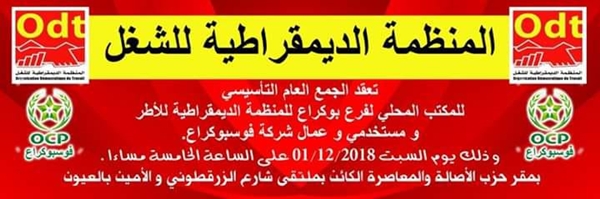 وقد أشرف المنسق الجهوي للمنظمة الديموقراطية للشغل والكاتب المحلي بالاقاليم الجنوبية السيد محمد التلفاني ، و الكاتب الفرع نقابة فوسبوكراع السيد الحيحي المحفوظ ، على تأسيس هذا الفرع بوكراع لمشاركة مكثفة لمناضلات و مناضلي المنظمة الديمقراطية للفوسفاط ، حيث جاء تأسيس هذا الفرع إستجابة لكل الإكراهات الجدية وسوء الأوضاع الاقتصادية والاجتماعية المتسمة بالاحتقان وضرب القدرة الشرائية للمواطنين والإجهاز على جل مكتسبات الطبقة الفوسفاطية العاملة و الطبقة العاملة الفوسبوكراعية خاصة والتنظيم النقابي بشكل عام بالمنطقة .
