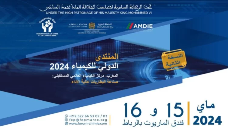 تعلن فدرالية الكيمياء وشبه الكيمياء عن تنظيم الدورة الثانية من المنتدى الدولي للكيمياء، تحت الرعاية السامية لصاحب الجلالة الملك محمد السادس، وذلك بالرباط يومي 15 و16 ماي 2024، بشراكة مع وزارة الصناعة والتجارة والوكالة المغربية لتنمية الاستثمارات والصادرات.