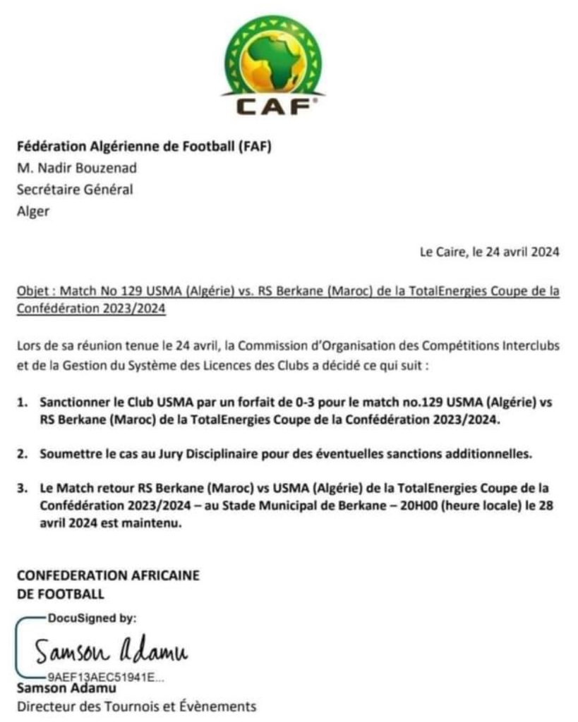 قررت لجنة الأندية والمسابقات التابعة للكونفدرالية الإفريقية لكرة القدم في اجتماع لها بالقاهرة نادي اتحاد العاصمة منهزماً أمام نهضة بركان في مباراة ذهاب نصف نهائي كأس الكونفيدرالية الإفريقية لكرة القدم.
