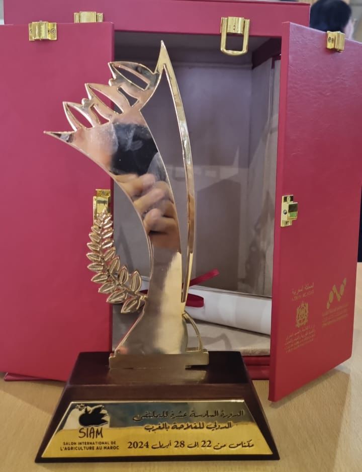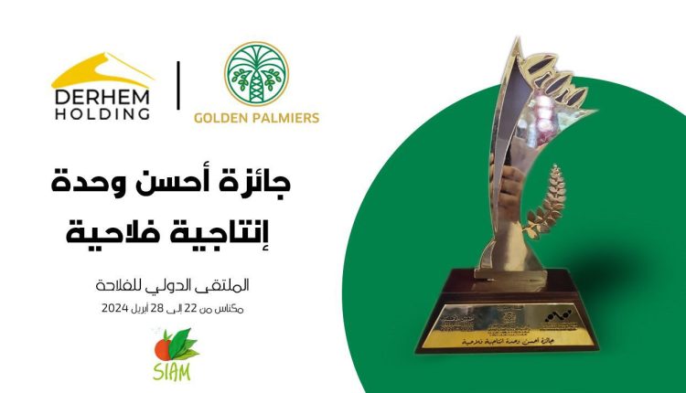تمكنت شركة “Golden Palmiers” التابعة ل “DERHEM Holding” من الحصول على جائزة الإستحقاق كأحسن وحدة إنتاجية فلاحية في سلسلة التمّور ببلادنا، خلال الدورة السادسة عشرة للملتقى الدولي للفلاحة بمكناس، والمنظم في الفترة ما بين 22 أبريل 2024 إلى غاية 28 أبريل 2024، تحت شعار: “المناخ والفلاحة.. من أجل نظم إنتاج مستدامة وقادرة على الصمود”.