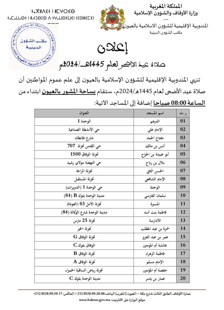العيـــون …هذه هي لائحة المساجد التي ستقام بها صلاة عيد الاضحى أخبار الصحراء إدارة الموقع نشر في 13 يونيو 2024 الساعة 22 و 58 دقيقة أفادت المندوبية الإقليمية للشؤون الإسلامية بالعيون، بأن صلاة عيد الاضحى لعام 1445 هــ/2024م ، ستقام بساحة المشور بالعيون، ابتداء من الساعة الثامنة صباحا من يوم العيد ، بالاضافة الى المساجد الأتية : مشاركة بفايسبوكFacebookFacebook مشاركة بتويترTwitterTwitter مشاركة بواتسابWhatsAppWhatsApp Share to ارسال ايميلEmailEmail مشاركة بلينكدانLinkedInLinkedIn مشاركة بمسنجرMessengerMessenger طباعةPrintطباعة رابط المشاركة : العيـــون …هذه هي لائحة المساجد التي ستقام بها صلاة عيد الاضحى