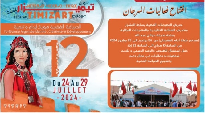 تحتضن مدينة تزنيت خلال الفترة من 24 إلى 29 يوليوز 2024، فعاليات الدورة الـ12 لمهرجان تيميزار للفضة، وذلك بمبادرة من جمعية تيميزار لمهرجان الفضة بتيزنيت.