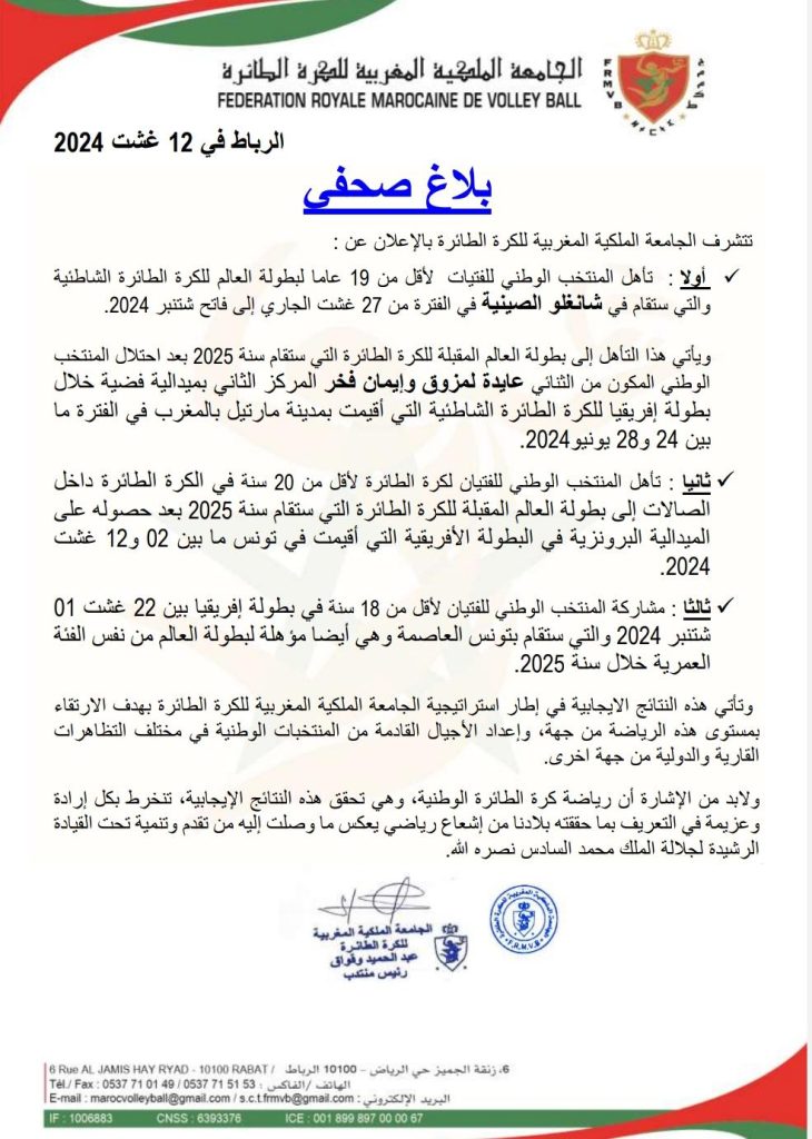 كما سيشارك المنتخب الوطني للفتيان لأقل من 18 سنة في بطولة إفريقيا للكرة الطائرة المقررة ما بين 22 غشت وفاتح شتنبر المقبل بتونس العاصمة، وهي مؤهلة لبطولة العالم 2025 لذات الفئة العمرية .