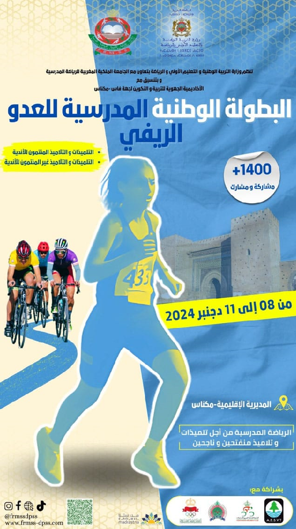 تنظم وزارة التربية الوطنية والتعليم الأولي والرياضة ،بتعاون مع الجامعة الملكية المغربية للرياضة المدرسية ،والجامعة الملكية المغربية للدراجات ،والجامعة الملكية المغربية لألعاب القوى، وبتنسيق مع الأكاديمية الجهوية للتربية والتكوين لجهة فاس مكناس، منافسات البطولة الوطنية المدرسية للعدو الريفي للجميع والنخبة في دورتها 59 والبطولة الوطنية المدرسية لسباق الدراجات، وذلك خلال الفترة الممتدة بين 08 و11 دجنبر 2024، بمدينة مكناس.
