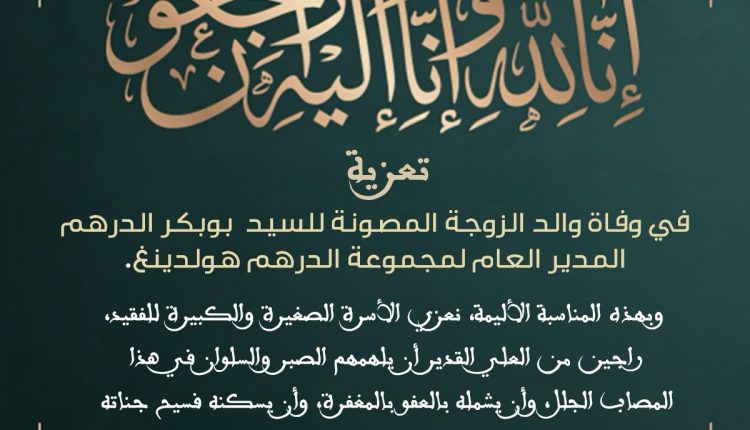 تلقت مؤسسة سي أحمد الدرهم بحزن عميق نبأ وفاة والد الزوجة المصونة للسيد بوبكر الدرهم، المدير العام لمجموعة الدرهم هولدينغ، سائلة الله أن يتغمده بواسع رحمته.