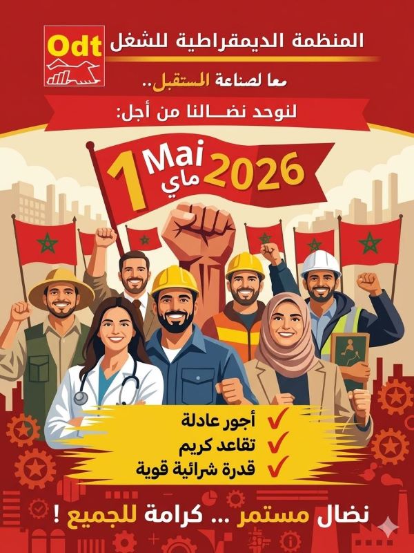 في نداء فاتح ماي 2026، جددت المنظمة الديمقراطية للشغل التأكيد على مركزية الملف الاجتماعي والاقتصادي في المرحلة الراهنة، داعية إلى إصلاحات مستعجلة تشمل تحسين الأجور، حماية القدرة الشرائية، وإرساء عدالة جبائية واجتماعية فعلية.